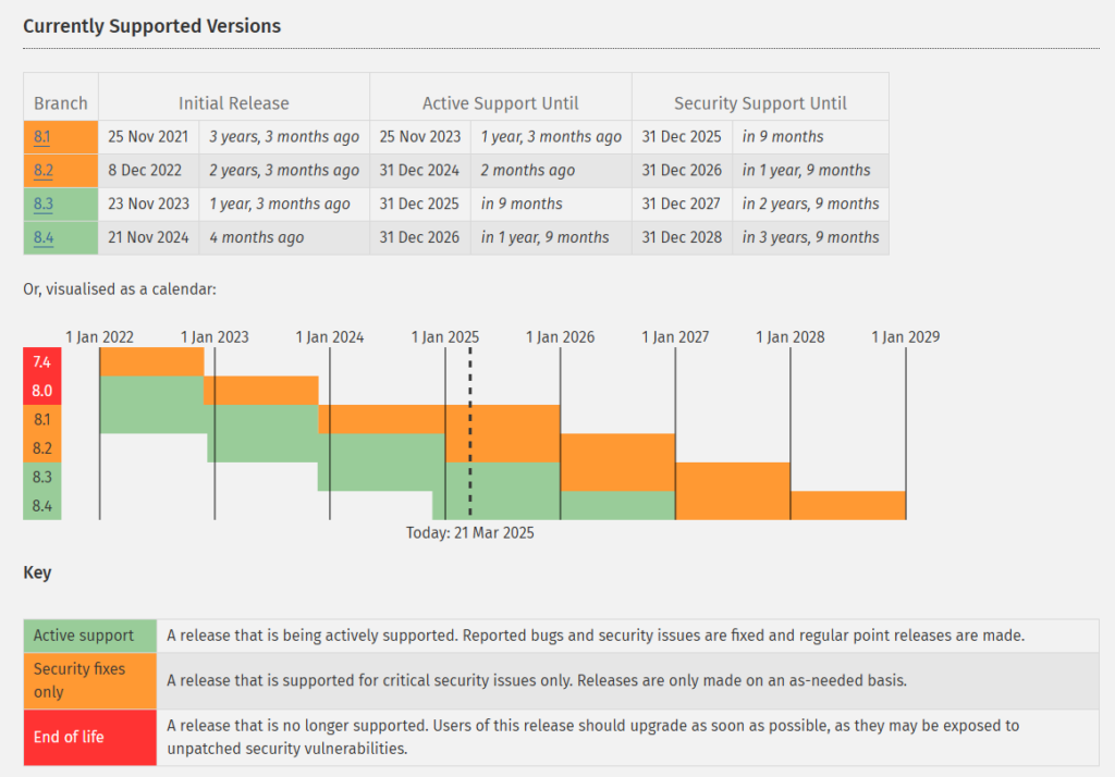 Według danych z PHP.net – każda wersja PHP jest wspierana przez ok. 2 lata aktualizacjami funkcjonalnymi i 1 dodatkowy rok poprawkami bezpieczeństwa.